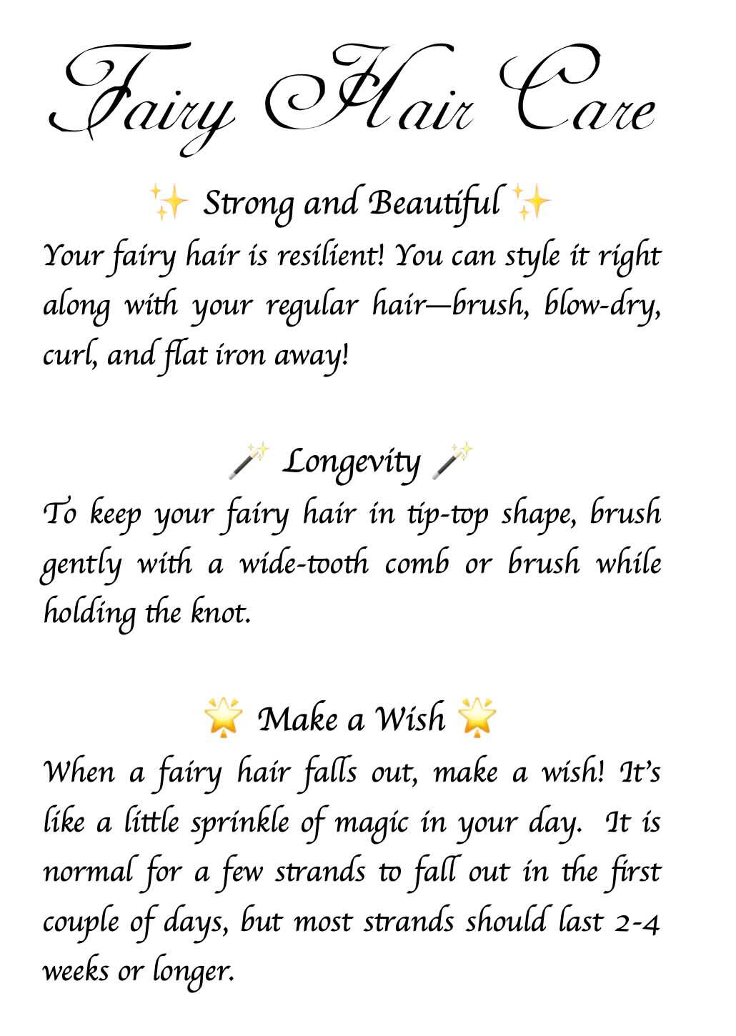 Fairy hair will stay in your hair until that individual strand of hair is ready to shed naturally. Some of your fairy hair strands will fall out right away while others will last 2-4 weeks and often times much longer!How do I take care of my fairy hair?