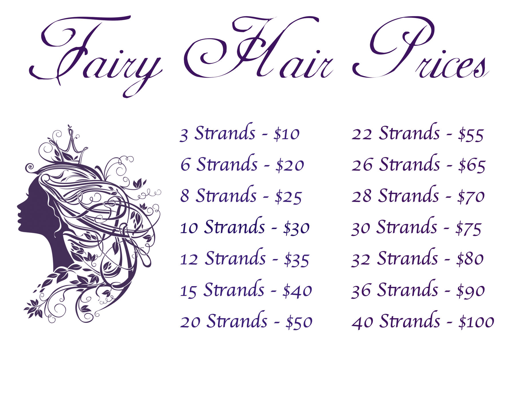How much do you charge for this service?Because a couple of strands usually fall out right away, Fairy Cynthia always adds in a few extra strands depending on the number of strands purchased.